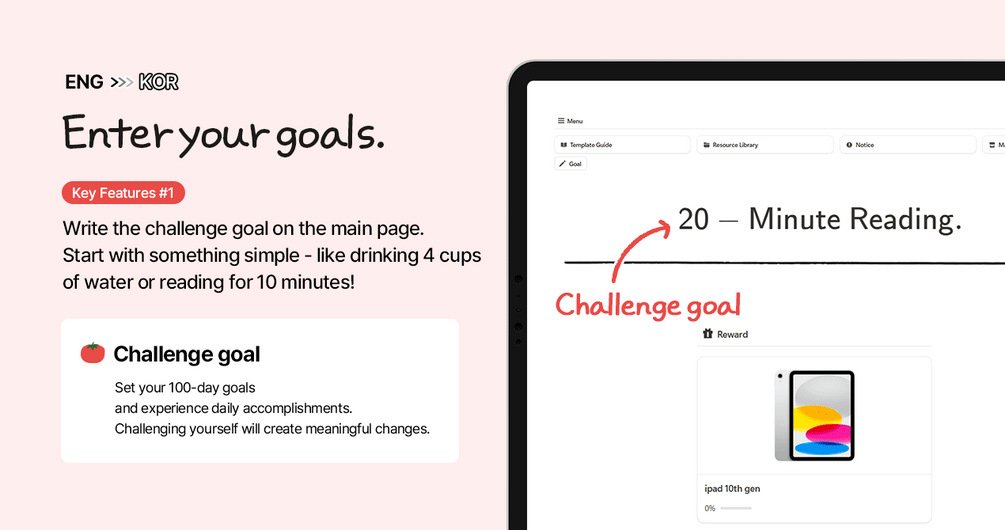 Set your 100-day goals and experience the satisfaction of daily accomplishments with this customizable Notion template. Whether you choose a 100-day or 50-day challenge, the power of setting goals and seeing progress is undeniable.