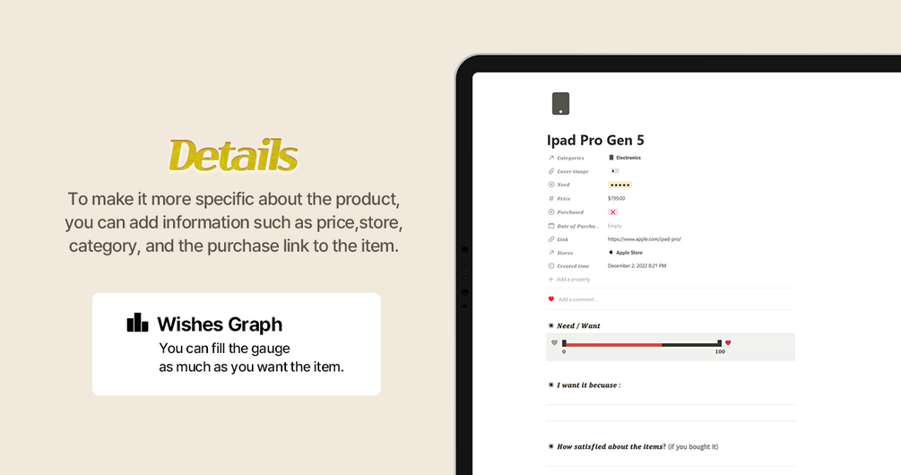 ✦ You can add information such as price, store, category, and purchase link to the item.
