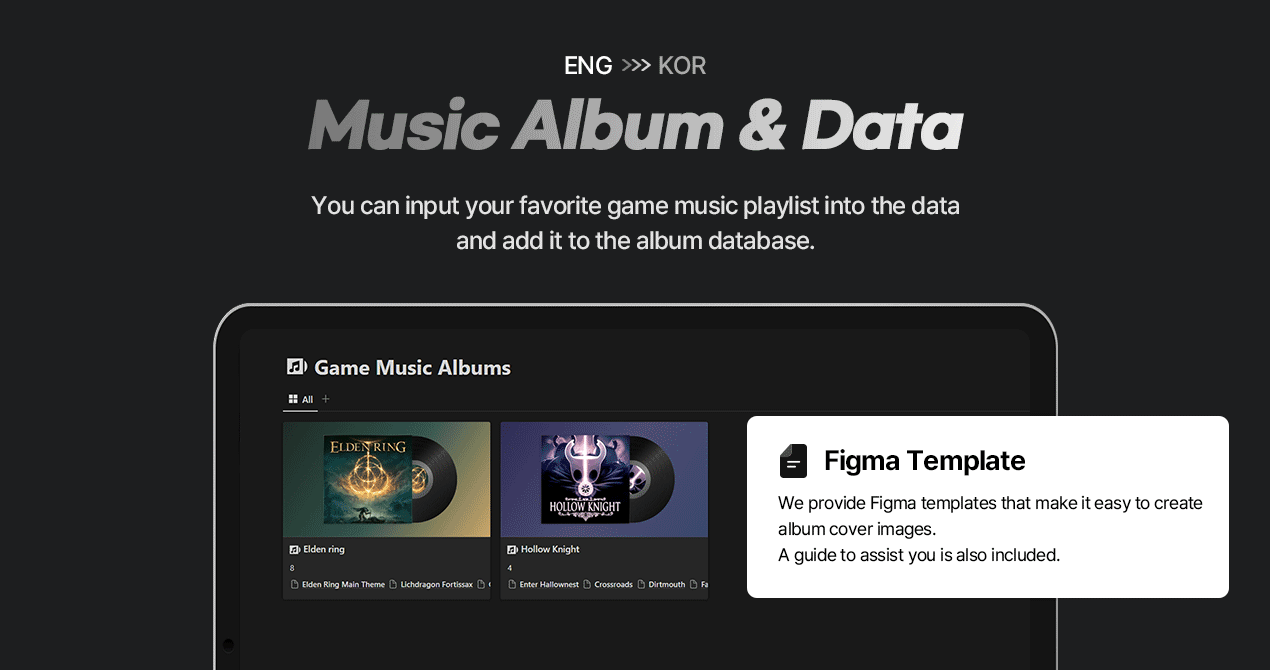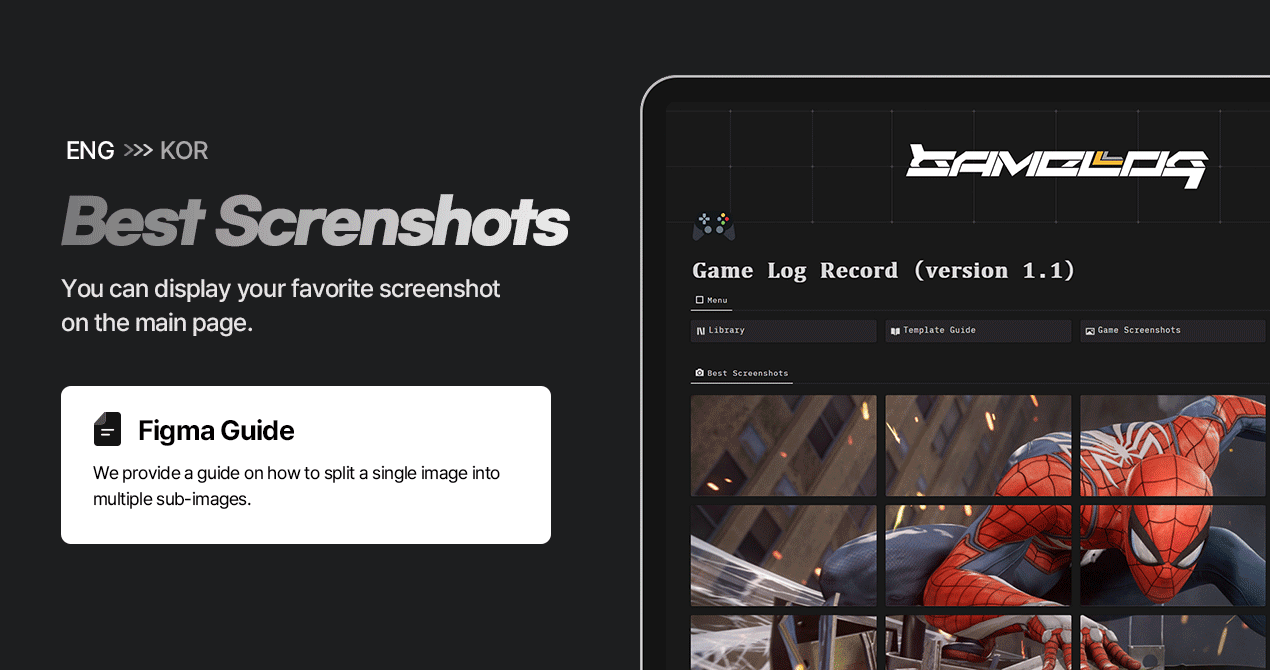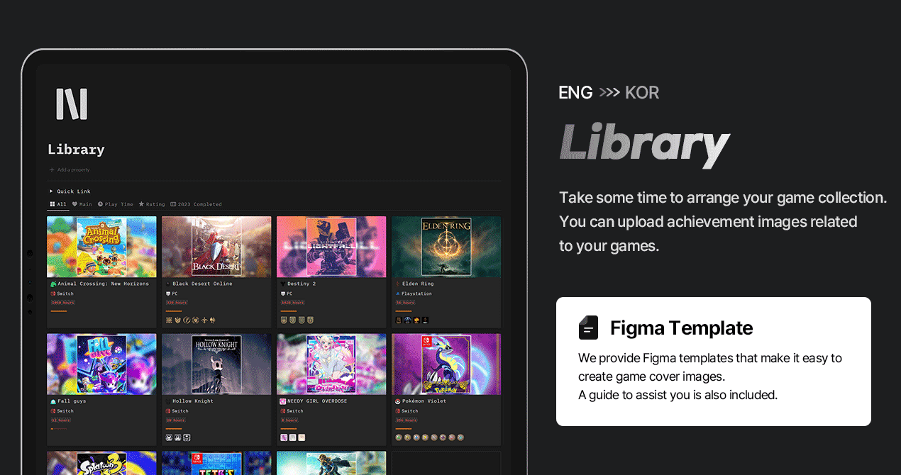 게임의 플레이 상태, 내가 가지고 있는 게임 수, 게임 완료 날짜 등을 지정하여 게임을 즐긴 추억을 되새길 수 있습니다. 게임 라이브러리를 정리하고 분류할 수 있고 피그마 템플릿을 이용하여 게임 커버 이미지를 꾸밀 수 있습니다. 좋아하는 스크린샷을 스크린샷 갤러리에 업로드하여 보관할 수도 있어요. 포함되어 있는 피그마 템플릿을 사용해서 노션 템플릿을 꾸며보세요.