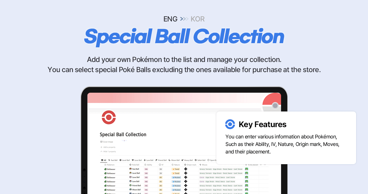 ✦ This template will be particularly useful for managing your special ball Pokémon collection.